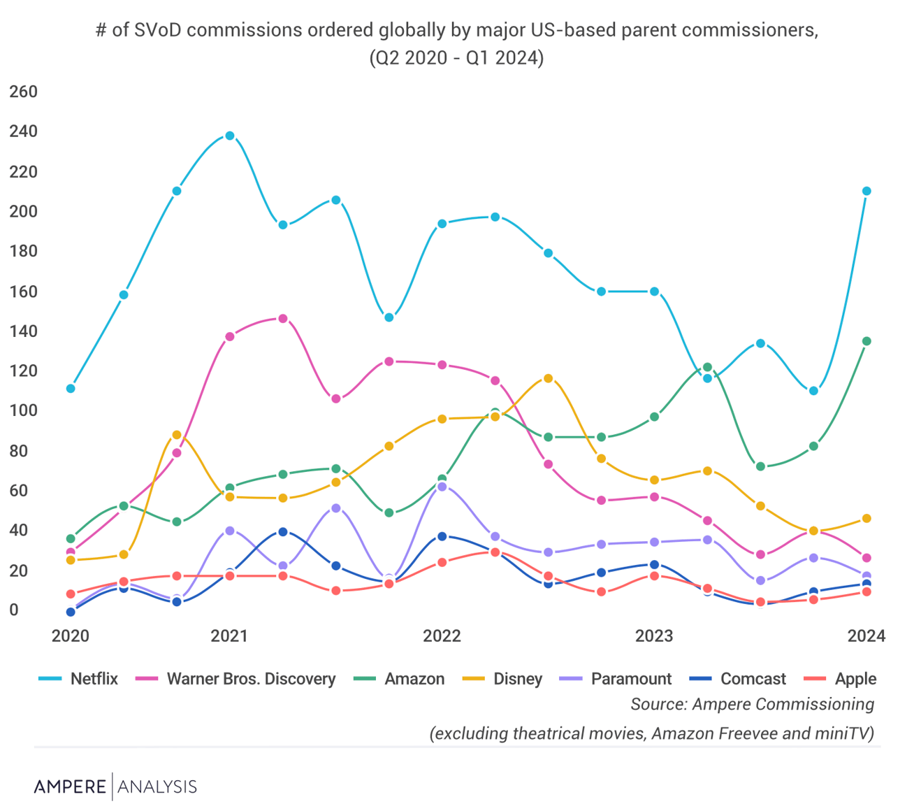 Au premier trimestre 2024, Netflix et Amazon ont repris leur domination sur les commandes d'originaux, après avoir été concurrencés ces dernières années par le lancement de plateformes de SVoD soutenues par les studios. Les dernières données d'Ampere indiquent que Netflix a commandé son plus grand nombre de nouveaux titres depuis le troisième trimestre 2021, tandis qu'Amazon a établi un nouveau record pour ses commandes trimestrielles. Cette résurgence des commandes originales coïncide avec la baisse des commandes des diffuseurs rivaux soucieux des coûts, ce qui signifie que les deux géants du streaming ont représenté plus de la moitié (53%) de toutes les commandes de SVoD au niveau mondial au 1er trimestre.