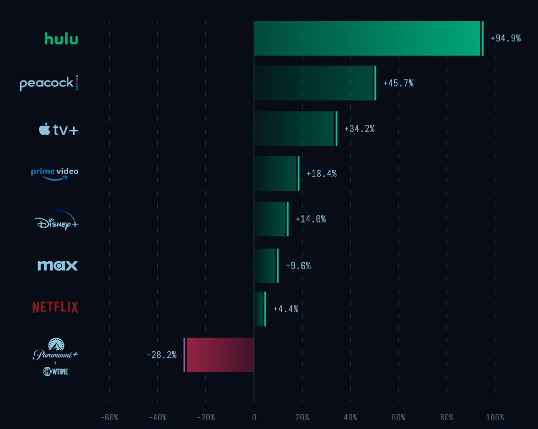 Hulu N°1. Malgré le retrait de plus de 300 titres de NBCUniversal, Hulu a vu son catalogue global augmenter de manière significative. son catalogue global s'est considérablement étoffé, ajoutant des films et des émissions à sa bibliothèque tout en se préparant à fusionner avec l'application Disney+ en 2024. tout en se préparant à fusionner avec l'application Disney+ en 2024. Pendant ce temps, Paramount+ a considérablement réduit son catalogue, Paramount+ a considérablement réduit son catalogue de films en 2023. d'autres fournisseurs de studios cherchent à économiser sur des éléments tels que les taxes et les redevances résiduelles. Tous les services ont procédé à des enrichissements de leur catalogue, à part Paramount+ qui a débranché près de 30% de son offre. Quant à Netflix, le nombre de titres n’a augmenté que de 4% l’an dernier.