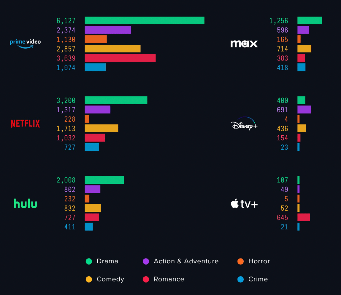 Prime Video N°1. La répartition des catalogues par genre permet de voir quelles sont les spécificités de chaque plateforme, mais aussi de constater les importants écarts de volumétrie qui existent entre les concurrents. Même si la quantité ne fait pas la qualité, Reelgood constate que Prime Video et Netflix proposent nettement plus de titres que leurs concurrents, avec le genre “Drame” en première position. On constate aussi que Prime Video dispose de l’offre la plus volumétrique dans tous les genres.