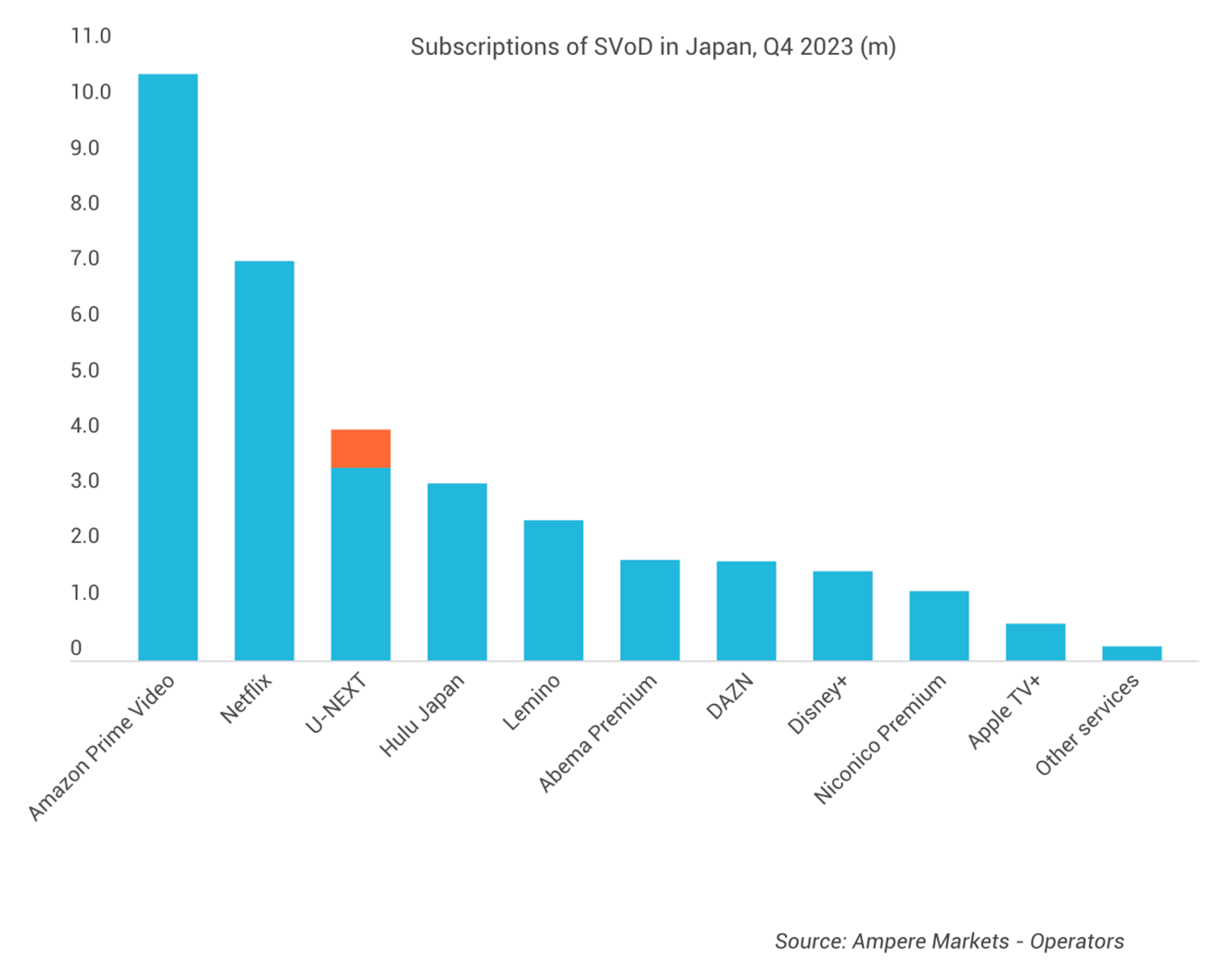 U-NEXT s’appuie sur ses contenus japonais, mais aussi d’accords avec les studios américains, Warner, NBCUiversal et Paramount pour rivaliser avec Netflix et Prime Video. U-NEXT propose aussi des services additionnels : mangas et des livres électroniques gratuits, des billets de cinéma gratuits et des abonnements supplémentaires à la plateforme de streaming sportif SPOTV NOW et à NHK On Demand. Selon Ampere Analysis, U-NEXT vise 5 millions d’abonnements en 2028. A distance de Prime Video et Netflix.